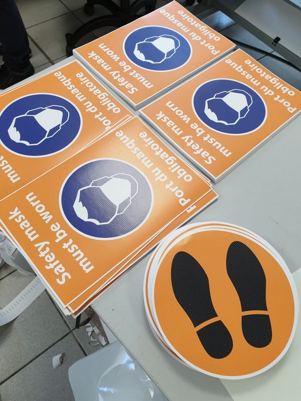 En stickers : Le vinyle peut aussi se distribuer du format timbre-poste à la carte de visite. Ils sont imprimés sur des vinyles spéciaux, le sticker se pose et se repositionne, sans dépôt de colle, sur les ordinateurs, les objets du quotidien professionnel etc..